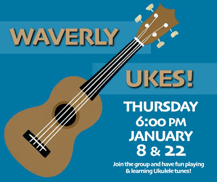 Waverly Ukes: For the month of January practices are on the second and fourth Thursdays at 6:00 PM. New members are always welcome!